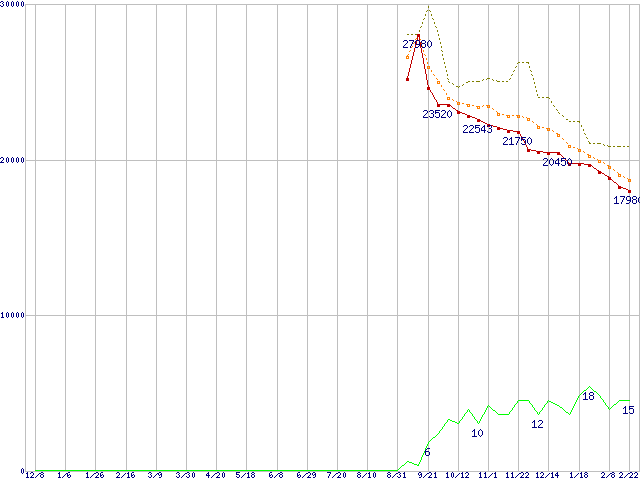 ※このグラフは過去のデータも税率5%相当に調整した税込み相当額のグラフです。 税率変更や、総額表示方式導入(2004年4月)の影響は除いています。 | | | ●凡例 | 最安値 (点線部は販売店未確認 または未調査) | 平均値 | 最高値 | ショップ数 |