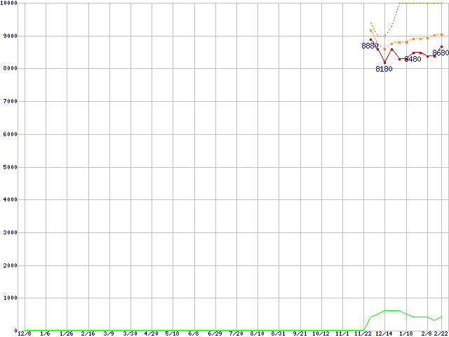 ※このグラフは過去のデータも税率5%相当に調整した税込み相当額のグラフです。 税率変更や、総額表示方式導入(2004年4月)の影響は除いています。 | | | ●凡例 | 最安値 (点線部は販売店未確認 または未調査) | 平均値 | 最高値 | ショップ数 |