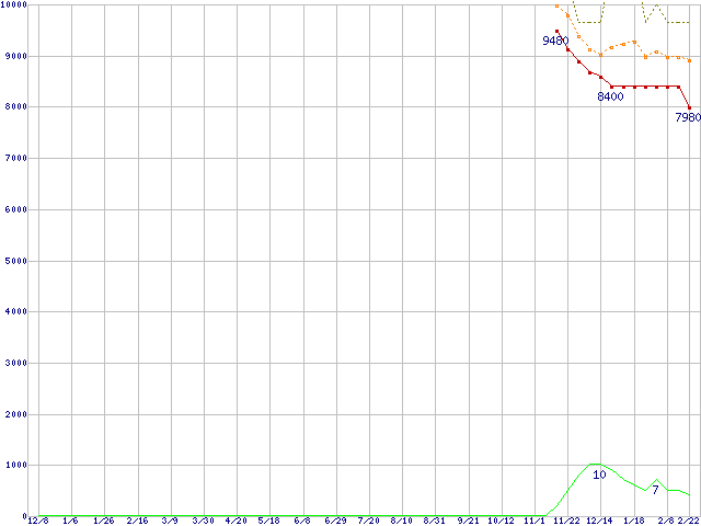※このグラフは過去のデータも税率5%相当に調整した税込み相当額のグラフです。 税率変更や、総額表示方式導入(2004年4月)の影響は除いています。 | | | ●凡例 | 最安値 (点線部は販売店未確認 または未調査) | 平均値 | 最高値 | ショップ数 |