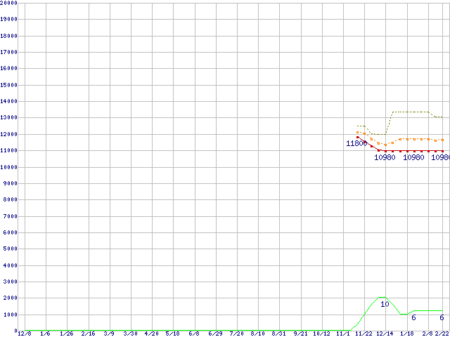 ※このグラフは過去のデータも税率5%相当に調整した税込み相当額のグラフです。 税率変更や、総額表示方式導入(2004年4月)の影響は除いています。 | | | ●凡例 | 最安値 (点線部は販売店未確認 または未調査) | 平均値 | 最高値 | ショップ数 |