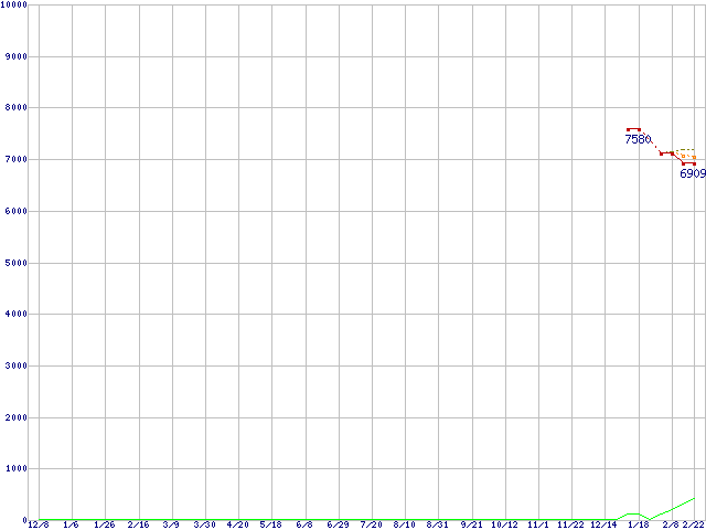 ※このグラフは過去のデータも税率5%相当に調整した税込み相当額のグラフです。 税率変更や、総額表示方式導入(2004年4月)の影響は除いています。 | | | ●凡例 | 最安値 (点線部は販売店未確認 または未調査) | 平均値 | 最高値 | ショップ数 |