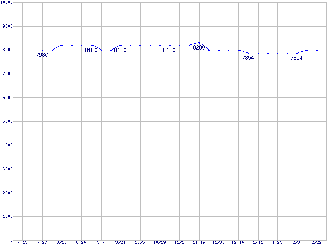 | SpinPoint P120 (7200rpm,SATA 3Gb/s,8MB)の最安値推移 | | | (2006年7月13日~2007年2月22日) |
