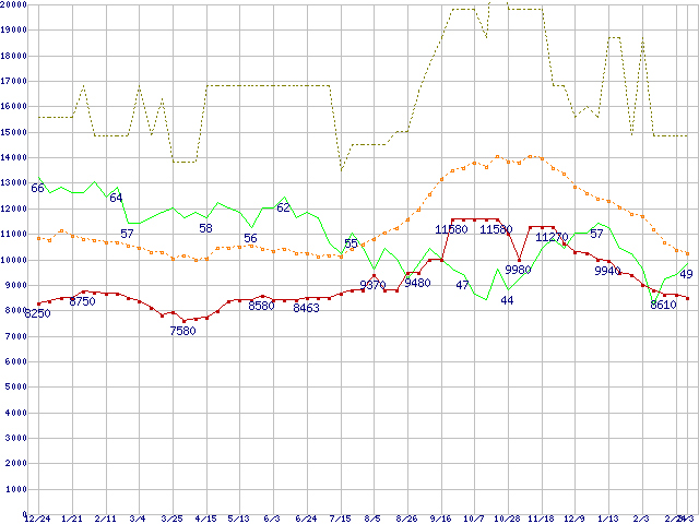 ※このグラフは過去のデータも税率5%相当に調整した税込み相当額のグラフです。 税率変更や、総額表示方式導入(2004年4月)の影響は除いています。 | | | ●凡例 | 最安値 (点線部は販売店未確認 または未調査) | 平均値 | 最高値 | ショップ数 |