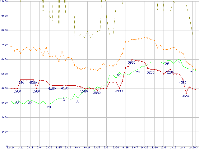 ※このグラフは過去のデータも税率5%相当に調整した税込み相当額のグラフです。 税率変更や、総額表示方式導入(2004年4月)の影響は除いています。 | | | ●凡例 | 最安値 (点線部は販売店未確認 または未調査) | 平均値 | 最高値 | ショップ数 |