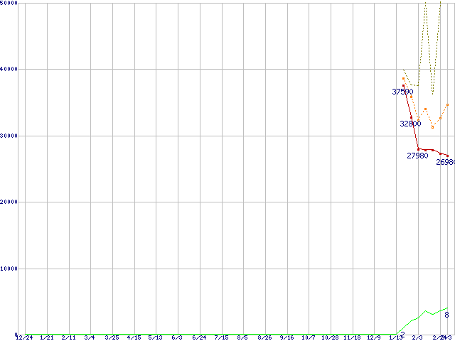 ※このグラフは過去のデータも税率5%相当に調整した税込み相当額のグラフです。 税率変更や、総額表示方式導入(2004年4月)の影響は除いています。 | | | ●凡例 | 最安値 (点線部は販売店未確認 または未調査) | 平均値 | 最高値 | ショップ数 |