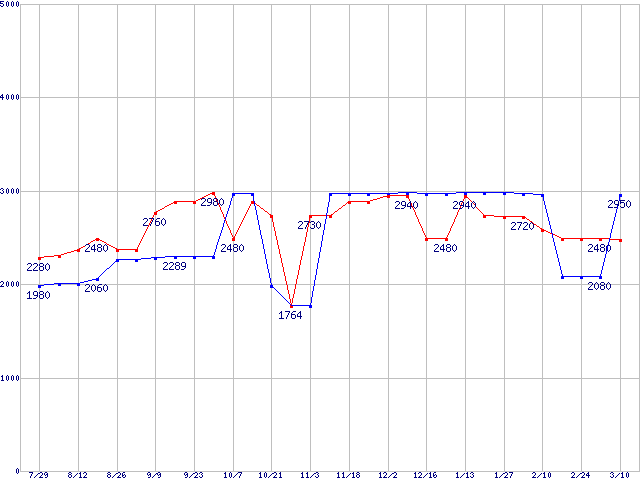 メモリ主要製品(最安値5千円未満)の最安値推移