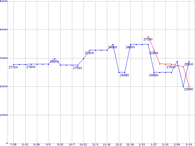 メモリ主要製品(最安値1万円以上)の最安値推移