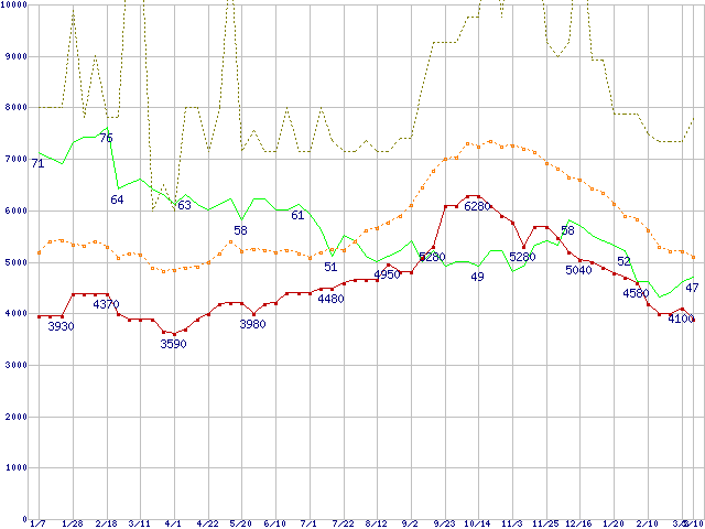 ※このグラフは過去のデータも税率5%相当に調整した税込み相当額のグラフです。 税率変更や、総額表示方式導入(2004年4月)の影響は除いています。 | | | ●凡例 | 最安値 (点線部は販売店未確認 または未調査) | 平均値 | 最高値 | ショップ数 |