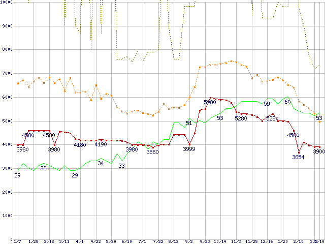 ※このグラフは過去のデータも税率5%相当に調整した税込み相当額のグラフです。 税率変更や、総額表示方式導入(2004年4月)の影響は除いています。 | | | ●凡例 | 最安値 (点線部は販売店未確認 または未調査) | 平均値 | 最高値 | ショップ数 |