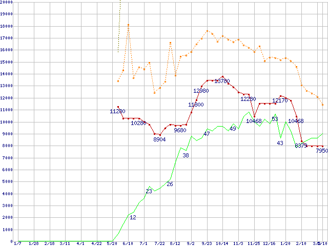 ※このグラフは過去のデータも税率5%相当に調整した税込み相当額のグラフです。 税率変更や、総額表示方式導入(2004年4月)の影響は除いています。 | | | ●凡例 | 最安値 (点線部は販売店未確認 または未調査) | 平均値 | 最高値 | ショップ数 |