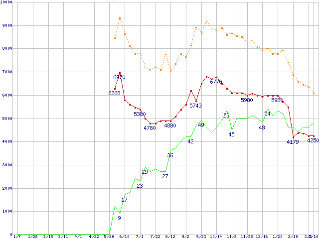 ※このグラフは過去のデータも税率5%相当に調整した税込み相当額のグラフです。 税率変更や、総額表示方式導入(2004年4月)の影響は除いています。 | | | ●凡例 | 最安値 (点線部は販売店未確認 または未調査) | 平均値 | 最高値 | ショップ数 |