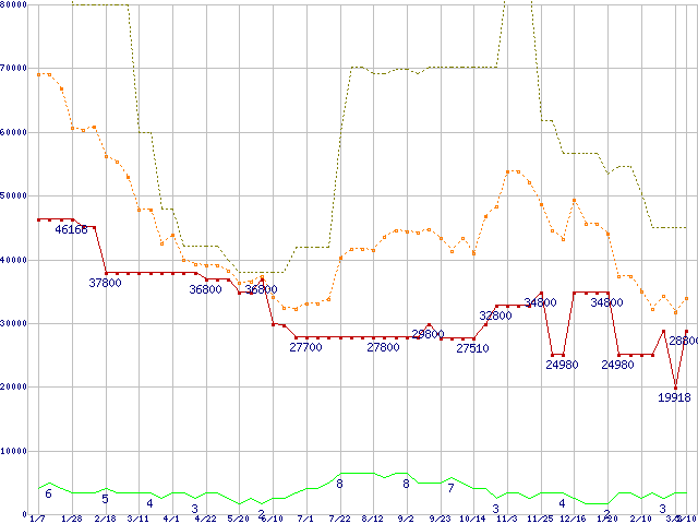 ※このグラフは過去のデータも税率5%相当に調整した税込み相当額のグラフです。 税率変更や、総額表示方式導入(2004年4月)の影響は除いています。 | | | ●凡例 | 最安値 (点線部は販売店未確認 または未調査) | 平均値 | 最高値 | ショップ数 |