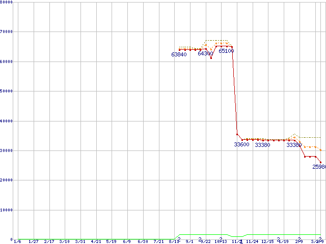 ※このグラフは過去のデータも税率5%相当に調整した税込み相当額のグラフです。 税率変更や、総額表示方式導入(2004年4月)の影響は除いています。 | | | ●凡例 | 最安値 (点線部は販売店未確認 または未調査) | 平均値 | 最高値 | ショップ数 |