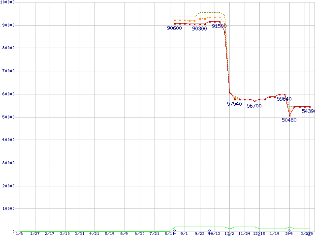 ※このグラフは過去のデータも税率5%相当に調整した税込み相当額のグラフです。 税率変更や、総額表示方式導入(2004年4月)の影響は除いています。 | | | ●凡例 | 最安値 (点線部は販売店未確認 または未調査) | 平均値 | 最高値 | ショップ数 |