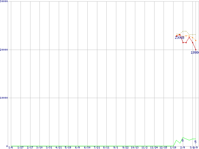 ※このグラフは過去のデータも税率5%相当に調整した税込み相当額のグラフです。 税率変更や、総額表示方式導入(2004年4月)の影響は除いています。 | | | ●凡例 | 最安値 (点線部は販売店未確認 または未調査) | 平均値 | 最高値 | ショップ数 |