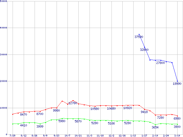 PC2-6400(DDR2-800) DDR2 SDRAM DIMMの最安値推移