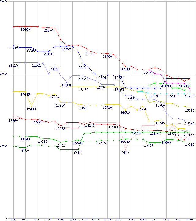 | CPU主要製品(最安値1万円~2万円未満)の最安値推移 | | | (2006年8月4日~2007年3月16日) |