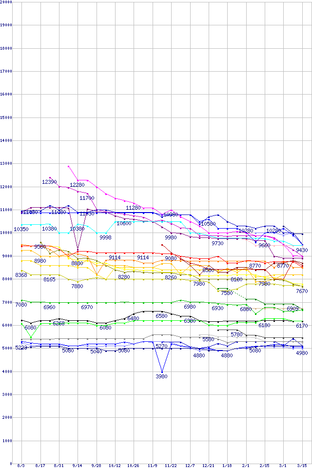| HDD主要製品(最安値1万円未満)の最安値推移 | | | (2006年8月3日~2007年3月15日) |