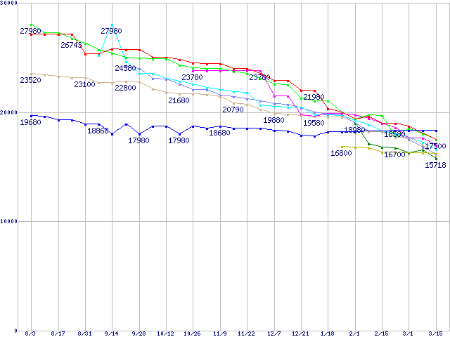 HDD主要製品(最安値1万5千円~2万円未満)の最安値推移