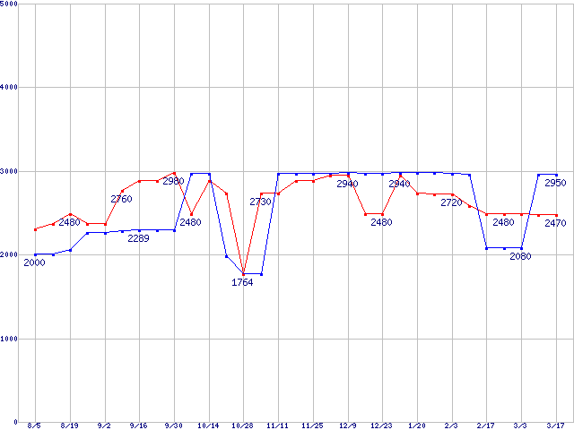 メモリ主要製品(最安値5千円未満)の最安値推移
