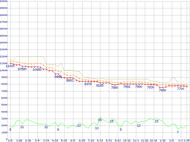 ※このグラフは過去のデータも税率5%相当に調整した税込み相当額のグラフです。 税率変更や、総額表示方式導入(2004年4月)の影響は除いています。 | | | ●凡例 | 最安値 (点線部は販売店未確認 または未調査) | 平均値 | 最高値 | ショップ数 |