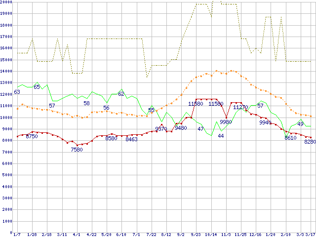 ※このグラフは過去のデータも税率5%相当に調整した税込み相当額のグラフです。 税率変更や、総額表示方式導入(2004年4月)の影響は除いています。 | | | ●凡例 | 最安値 (点線部は販売店未確認 または未調査) | 平均値 | 最高値 | ショップ数 |