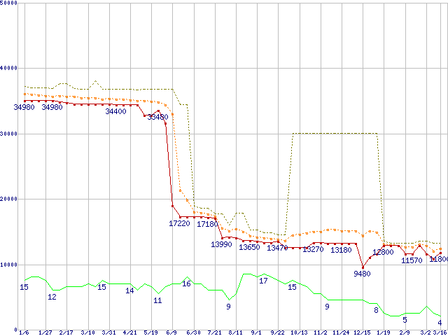 | Athlon 64 3800+ (2.4GHz,L2 512KB,Socket 939)の価格推移 | | | (2006年1月6日~2007年3月16日) |