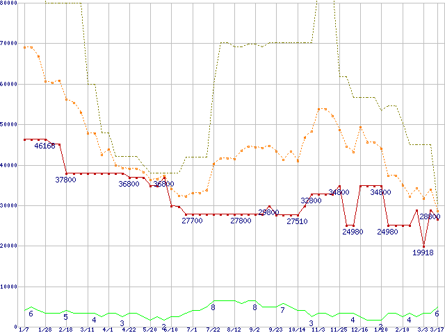 ※このグラフは過去のデータも税率5%相当に調整した税込み相当額のグラフです。 税率変更や、総額表示方式導入(2004年4月)の影響は除いています。 | | | ●凡例 | 最安値 (点線部は販売店未確認 または未調査) | 平均値 | 最高値 | ショップ数 |
