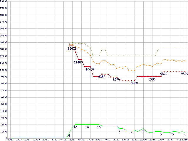 ※このグラフは過去のデータも税率5%相当に調整した税込み相当額のグラフです。 税率変更や、総額表示方式導入(2004年4月)の影響は除いています。 | | | ●凡例 | 最安値 (点線部は販売店未確認 または未調査) | 平均値 | 最高値 | ショップ数 |