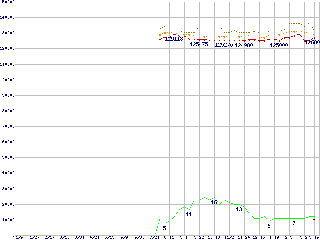 ※このグラフは過去のデータも税率5%相当に調整した税込み相当額のグラフです。 税率変更や、総額表示方式導入(2004年4月)の影響は除いています。 | | | ●凡例 | 最安値 (点線部は販売店未確認 または未調査) | 平均値 | 最高値 | ショップ数 |