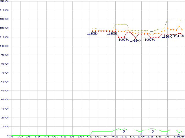 ※このグラフは過去のデータも税率5%相当に調整した税込み相当額のグラフです。 税率変更や、総額表示方式導入(2004年4月)の影響は除いています。 | | | ●凡例 | 最安値 (点線部は販売店未確認 または未調査) | 平均値 | 最高値 | ショップ数 |