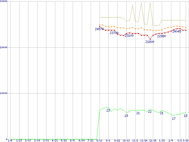 ※このグラフは過去のデータも税率5%相当に調整した税込み相当額のグラフです。 税率変更や、総額表示方式導入(2004年4月)の影響は除いています。 | | | ●凡例 | 最安値 (点線部は販売店未確認 または未調査) | 平均値 | 最高値 | ショップ数 |
