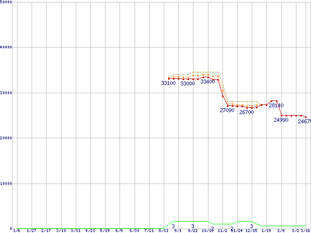 ※このグラフは過去のデータも税率5%相当に調整した税込み相当額のグラフです。 税率変更や、総額表示方式導入(2004年4月)の影響は除いています。 | | | ●凡例 | 最安値 (点線部は販売店未確認 または未調査) | 平均値 | 最高値 | ショップ数 |