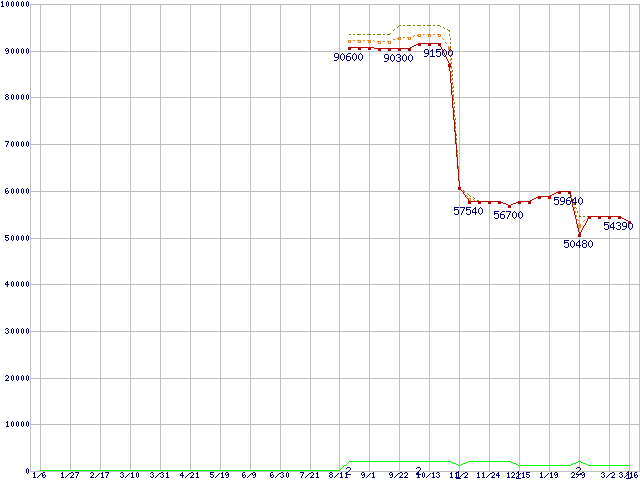 ※このグラフは過去のデータも税率5%相当に調整した税込み相当額のグラフです。 税率変更や、総額表示方式導入(2004年4月)の影響は除いています。 | | | ●凡例 | 最安値 (点線部は販売店未確認 または未調査) | 平均値 | 最高値 | ショップ数 |