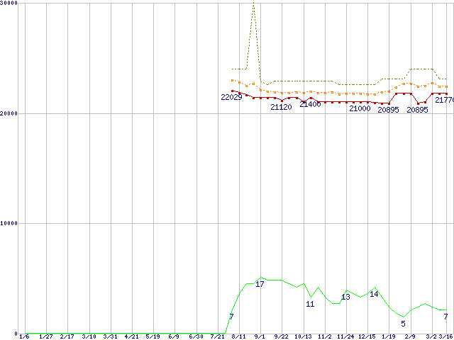 ※このグラフは過去のデータも税率5%相当に調整した税込み相当額のグラフです。 税率変更や、総額表示方式導入(2004年4月)の影響は除いています。 | | | ●凡例 | 最安値 (点線部は販売店未確認 または未調査) | 平均値 | 最高値 | ショップ数 |
