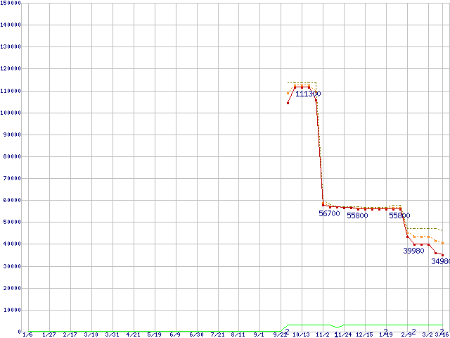 ※このグラフは過去のデータも税率5%相当に調整した税込み相当額のグラフです。 税率変更や、総額表示方式導入(2004年4月)の影響は除いています。 | | | ●凡例 | 最安値 (点線部は販売店未確認 または未調査) | 平均値 | 最高値 | ショップ数 |