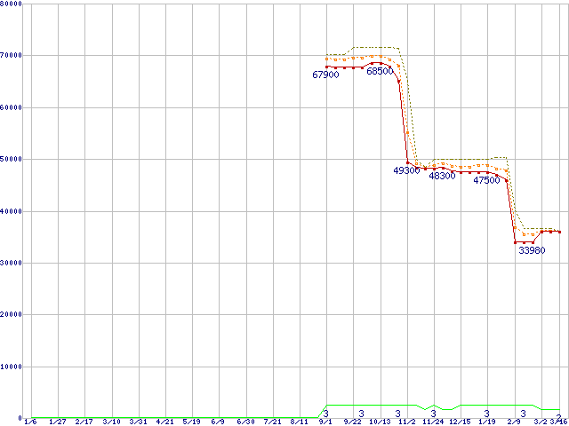 ※このグラフは過去のデータも税率5%相当に調整した税込み相当額のグラフです。 税率変更や、総額表示方式導入(2004年4月)の影響は除いています。 | | | ●凡例 | 最安値 (点線部は販売店未確認 または未調査) | 平均値 | 最高値 | ショップ数 |