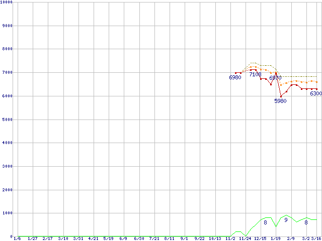 ※このグラフは過去のデータも税率5%相当に調整した税込み相当額のグラフです。 税率変更や、総額表示方式導入(2004年4月)の影響は除いています。 | | | ●凡例 | 最安値 (点線部は販売店未確認 または未調査) | 平均値 | 最高値 | ショップ数 |