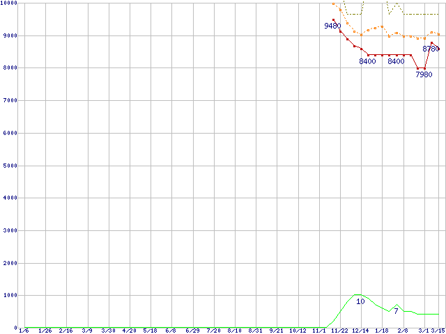 ※このグラフは過去のデータも税率5%相当に調整した税込み相当額のグラフです。 税率変更や、総額表示方式導入(2004年4月)の影響は除いています。 | | | ●凡例 | 最安値 (点線部は販売店未確認 または未調査) | 平均値 | 最高値 | ショップ数 |