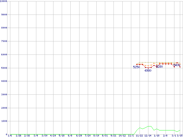 ※このグラフは過去のデータも税率5%相当に調整した税込み相当額のグラフです。 税率変更や、総額表示方式導入(2004年4月)の影響は除いています。 | | | ●凡例 | 最安値 (点線部は販売店未確認 または未調査) | 平均値 | 最高値 | ショップ数 |