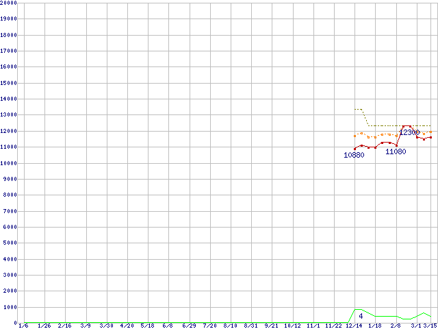 ※このグラフは過去のデータも税率5%相当に調整した税込み相当額のグラフです。 税率変更や、総額表示方式導入(2004年4月)の影響は除いています。 | | | ●凡例 | 最安値 (点線部は販売店未確認 または未調査) | 平均値 | 最高値 | ショップ数 |