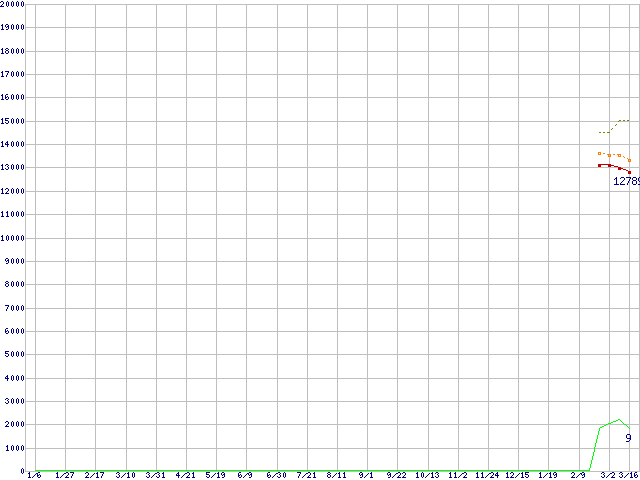 ※このグラフは過去のデータも税率5%相当に調整した税込み相当額のグラフです。 税率変更や、総額表示方式導入(2004年4月)の影響は除いています。 | | | ●凡例 | 最安値 (点線部は販売店未確認 または未調査) | 平均値 | 最高値 | ショップ数 |