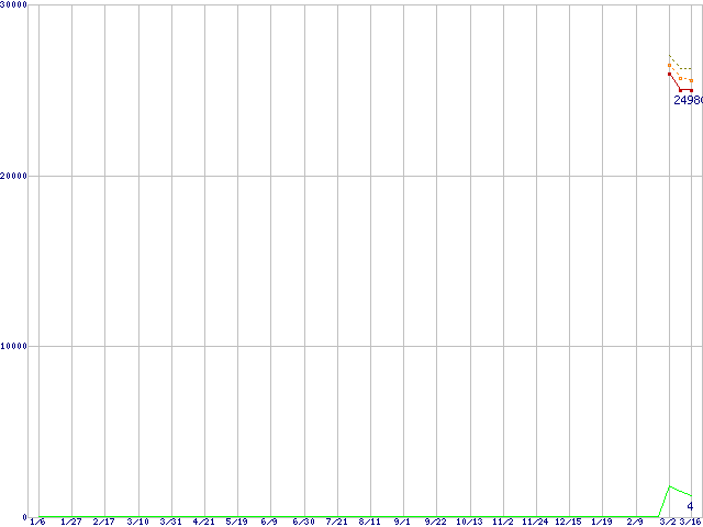 ※このグラフは過去のデータも税率5%相当に調整した税込み相当額のグラフです。 税率変更や、総額表示方式導入(2004年4月)の影響は除いています。 | | | ●凡例 | 最安値 (点線部は販売店未確認 または未調査) | 平均値 | 最高値 | ショップ数 |