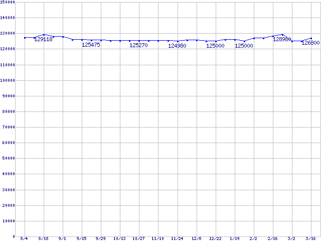 | LGA775 (FSB 1066MHz,L2 4MB,Dual Core,EM64T対応,TDP 75W)の最安値推移 | | | (2006年8月4日~2007年3月16日) |