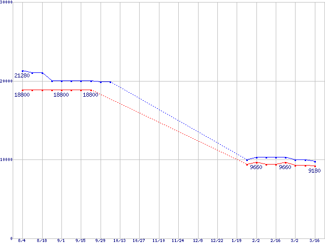 | LGA775 (FSB 800MHz,L2 2MB,Hyper-Threading,EM64T対応)の最安値推移 | | | (2006年8月4日~2007年3月16日) |