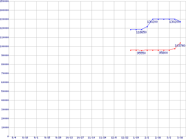 | LGA771(FSB 1333MHz,Quad Core,L2 4MB×2,TDP 80W)の最安値推移 | | | (2006年8月4日~2007年3月16日) |