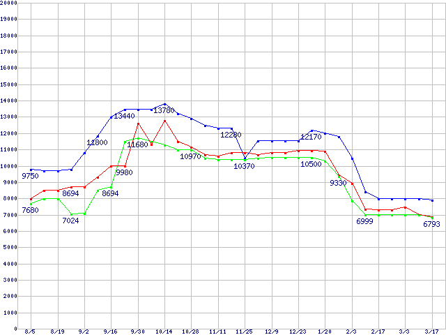 メモリ主要製品(最安値1万円以上)の最安値推移