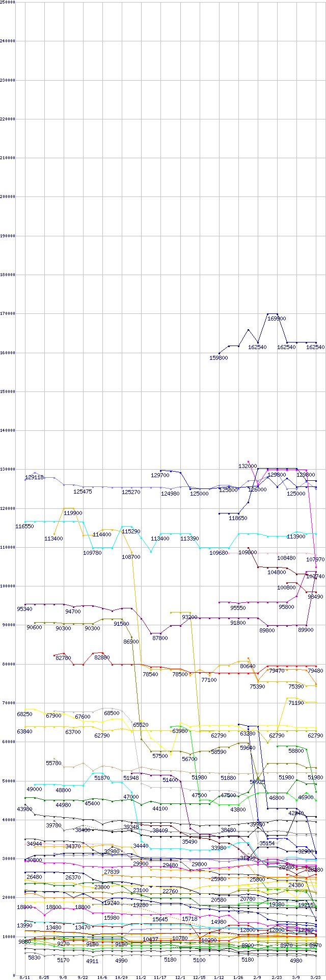 | 凡例 | Xeon X5355(2.66GHz) | Xeon E5345(2.33GHz) | Core 2 Extreme QX6700 (2.66GHz) | Core 2 Extreme X6800 (2.93GHz) | Xeon 5160(3GHz) | Core 2 Quad Q6600 (2.40GHz,L2 4MB×2) | Athlon 64 FX-74 (3.0GHz) ※2個セットの価格 | Xeon E5335(2.00GHz) | Xeon 5150(2.66GHz) | Athlon 64 FX-72 (2.8GHz) ※2個セットの価格 | Opteron 2220 (2.8GHz) | Core 2 Duo T7600 (2.33GHz,L2 4MB) | Athlon 64 FX-70 (2.6GHz) ※2個セットの価格 | Opteron 2218 (2.6GHz) | Xeon 5140(2.33GHz) | Core 2 Duo E6700 (2.66GHz,L2 4MB) | Xeon E5320(1.86GHz) | Opteron 2216 (2.4GHz) | Core 2 Duo T7400 (2.16GHz,L2 4MB) | Xeon 5130(2GHz) | Athlon 64 X2 6000+ (3.0GHz,L2 1MB×2) | Xeon E5310(1.60GHz) | Xeon 5120(1.86GHz) | Core 2 Duo E6600 (2.40GHz,L2 4MB) | Core 2 Duo T7200 (2.00GHz,L2 4MB) | Opteron 2214 (2.2GHz) | Xeon 5110(1.6GHz) | Athlon 64 X2 5600+ (2.8GHz,L2 1MB×2) | Athlon 64 X2 5400+ (2.8GHz,L2 512KB×2) | Core 2 Duo T5600 (1.83GHz,L2 2MB) | Opteron 2212 (2.0GHz) | Turion 64 X2 TL-56 (1.8GHz,512KB×2) | Core 2 Duo E6400 (2.13GHz,L2 2MB) | Athlon 64 X2 4600+ (2.4GHz,L2 512KB×2,Socket 939) バルク | Athlon 64 X2 5200+ (2.6GHz,L2 1MB×2) | Athlon 64 X2 5000+ (2.6GHz,L2 512KB×2) | Athlon 64 X2 5000+ (2.6GHz,L2 512KB×2,TDP65W) | Athlon 64 X2 4400+ (2.2GHz,L2 1MB×2,Socket 939) バルク | Core 2 Duo T5500 (1.66GHz,L2 2MB) | Opteron 2210 (1.8GHz) | Core 2 Duo E6300 (1.86GHz,L2 2MB) | Athlon 64 X2 4200+ (2.2GHz,L2 512KB×2,Socket 939) バルク | Core 2 Duo E4300 (1.80GHz,L2 2MB) | Pentium D 945 (3.4GHz) | Athlon 64 X2 4800+ (2.5GHz,L2 512KB×2,TDP65W) | Turion 64 X2 TL-50 (1.6GHz,256KB×2) | Athlon 64 X2 4400+ (2.3GHz,L2 512KB×2,TDP65W) | Pentium D 935 (3.2GHz) | Celeron M 520 (1.60GHz) | Athlon 64 X2 4600+ (2.4GHz,L2 512KB×2,TDP65W) | Pentium D 925 (3.0GHz) | Athlon 64 X2 4000+ (2.1GHz,L2 512KB×2,TDP65W) | Athlon 64 X2 4200+ (2.2GHz,L2 512KB×2,TDP65W) | Athlon 64 X2 3800+ (2.0GHz,L2 512KB×2,TDP65W) | Athlon 64 4000+ (2.6GHz,L2 512KB) | Sempron 3600+ (2.0GHz,L2 256KB) | Athlon 64 3800+ (2.4GHz,L2 512KB) | Athlon 64 X2 3600+ (1.9GHz,L2 512KB×2,TDP65W) | Pentium D 915 (2.8GHz) | Athlon 64 3800+ (2.4GHz,L2 512KB,TDP 45W) | Athlon 64 3500+ (2.2GHz,L2 512KB,TDP 45W) | Athlon 64 3500+ (2.2GHz,L2 512KB) | Athlon 64 3800+ (2.4GHz,L2 512KB,Socket 939) | Sempron 3500+ (2.0GHz,L2 128KB) | Pentium 4 641 (3.20GHz) | Athlon 64 3200+ (2.0GHz,L2 512KB) | Athlon 64 3500+ (2.2GHz,L2 512KB,Socket 939) | Pentium 4 631 (3GHz) | Sempron 3400+ (1.8GHz,L2 256KB) | Celeron D 360 (3.46GHz) | Geode NX 1500@6W (1GHz) バルク | Celeron D 356 (3.33GHz) | Celeron D 352 (3.20GHz) | Sempron 3200+ (1.8GHz,L2 128KB) | Celeron D 347 (3.06GHz) | Sempron 3000+ (1.6GHz,L2 256KB) | Sempron 2800+ (1.6GHz,L2 128KB) | ※製品名をクリックすると個別のグラフを表示します ※点線部は販売店が確認できなかった、または調査データがないことを示します |