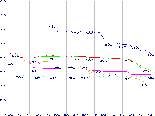 HDD主要製品(最安値1万5千円~2万円未満)の最安値推移