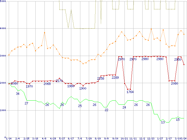 ※このグラフは過去のデータも税率5%相当に調整した税込み相当額のグラフです。 税率変更や、総額表示方式導入(2004年4月)の影響は除いています。 | | | ●凡例 | 最安値 (点線部は販売店未確認 または未調査) | 平均値 | 最高値 | ショップ数 |
